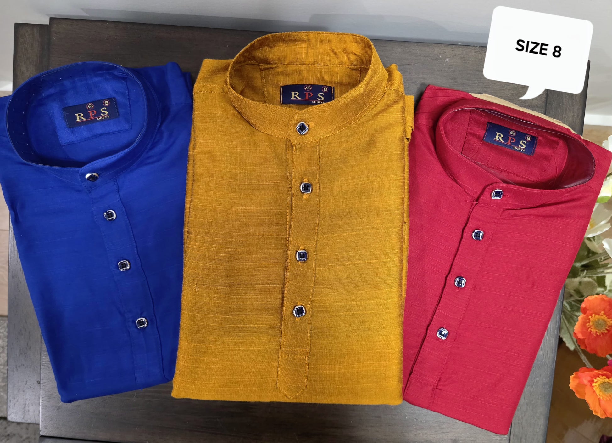 This boys' Indian traditional set features a semi-silk kurtha paired with a Velcro mundu/dhoti, designed for children aged 8 years. Ideal for festive occasions, the kurtha offers a refined look with comfortable fabric, while the Velcro mundu ensures easy wear and secure fit. This combination blends traditional style with practical design, making it perfect for celebrations and cultural events.