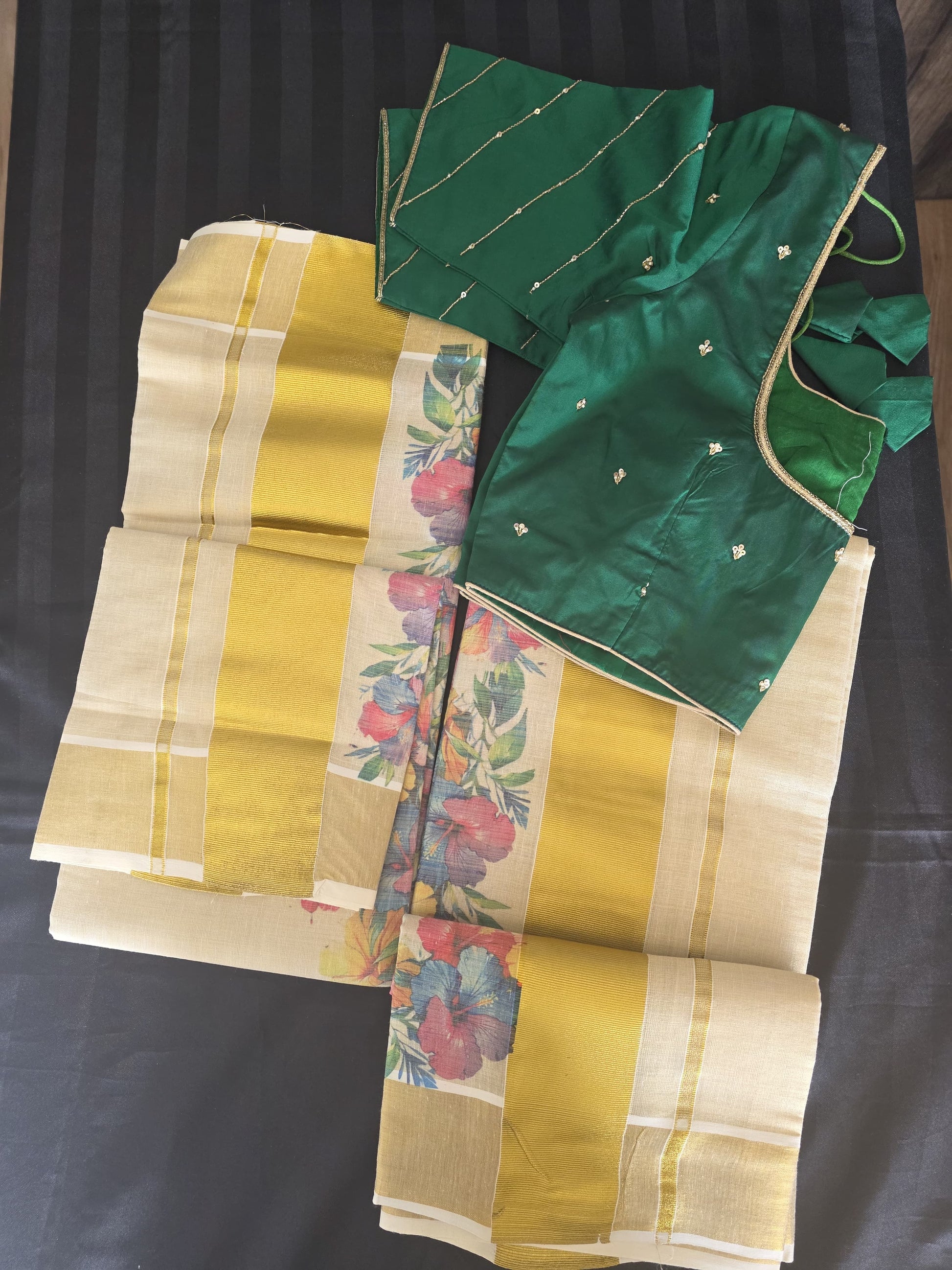 Experience the elegance of traditional Kerala craftsmanship with this Cotton Golden Zari Set Mundu, paired with a ready-to-wear stitched blouse. Crafted from breathable cotton, this set offers comfort and durability, while the golden zari detailing adds a refined touch of luxury. Perfect for festive occasions or cultural events, it combines classic style with modern convenience, ensuring you look graceful and feel comfortable throughout the day.