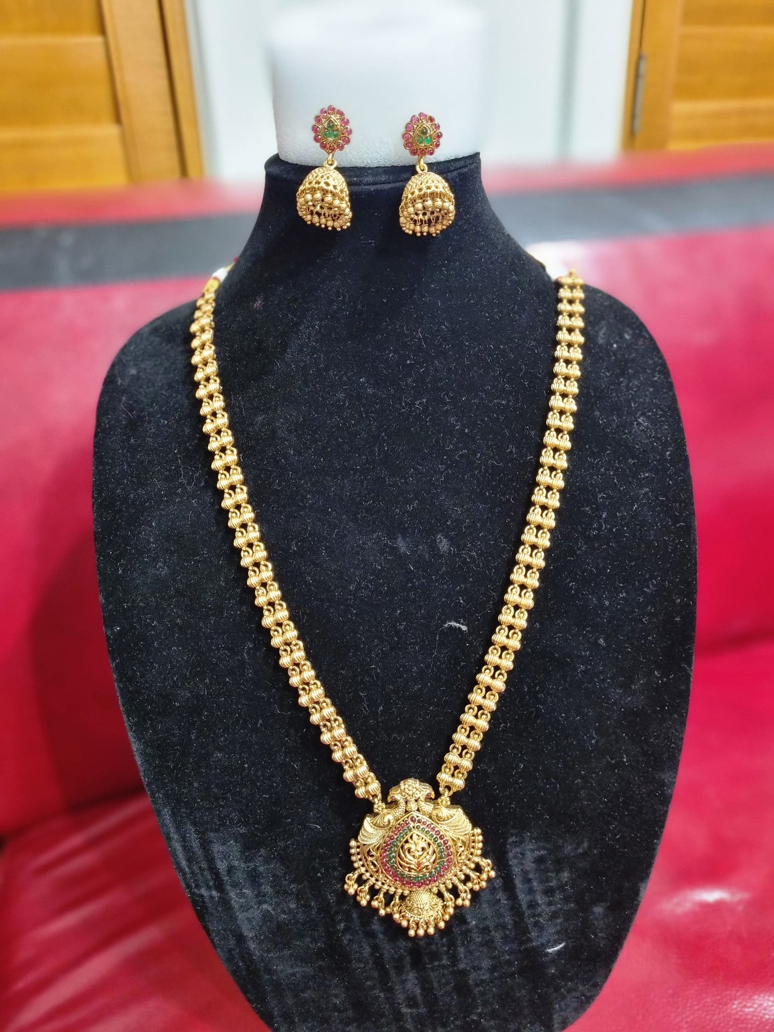 This exquisite antique long haram features a stunning combination of ruby and green stones, elegantly paired with traditional jhumka earrings.