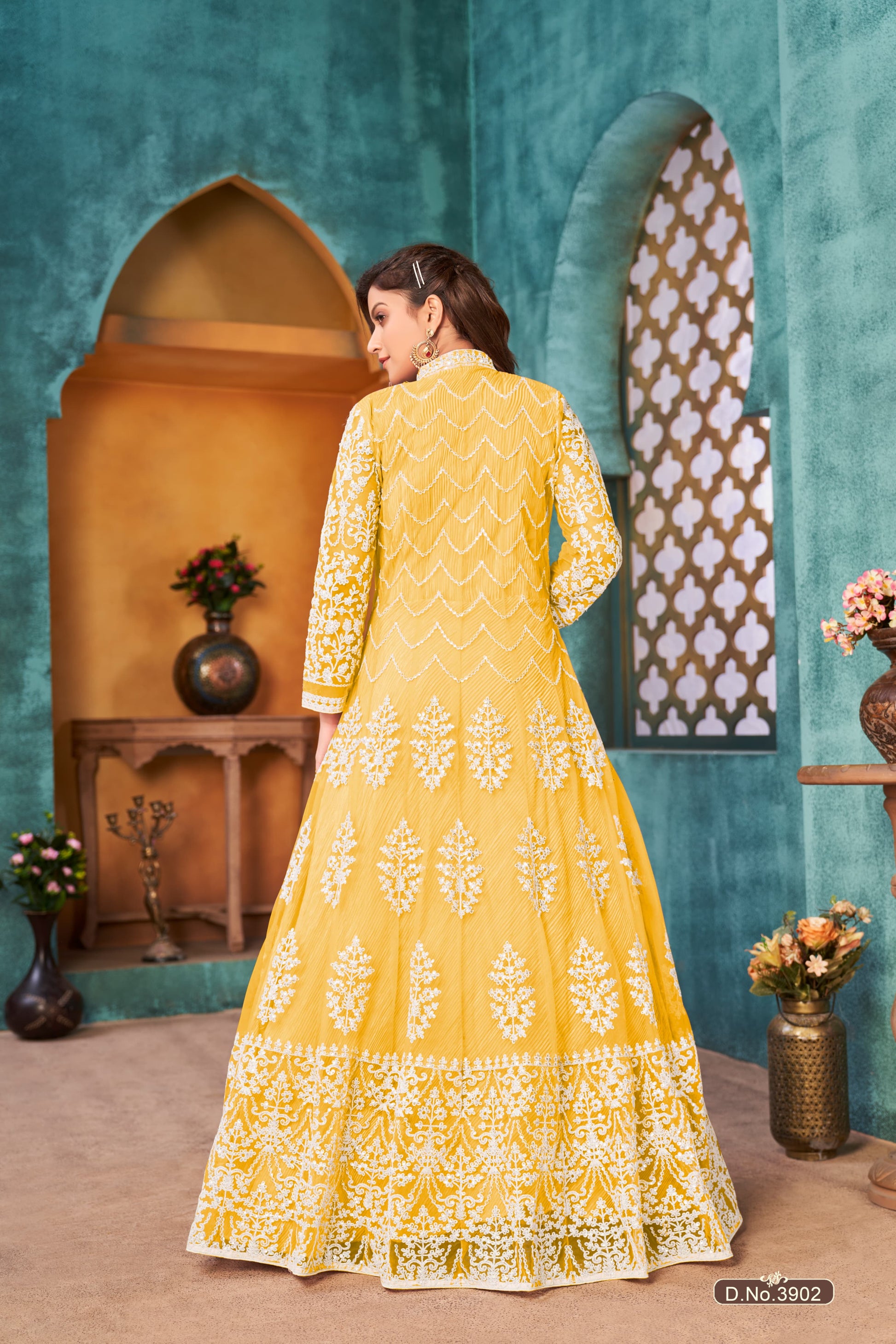 This Yellow Heavy Sequence Salwar Suit in size L features a net top adorned with intricate cording and sequins, offering a luxurious and elegant look. The inner layer is crafted from soft crush satin for comfort, while the santoon bottom ensures durability and ease of wear. Completing the ensemble is a matching net dupatta, perfect for festive occasions or special events. This suit combines rich textures and detailed embellishments to elevate your traditional wardrobe with expert craftsmanship.
