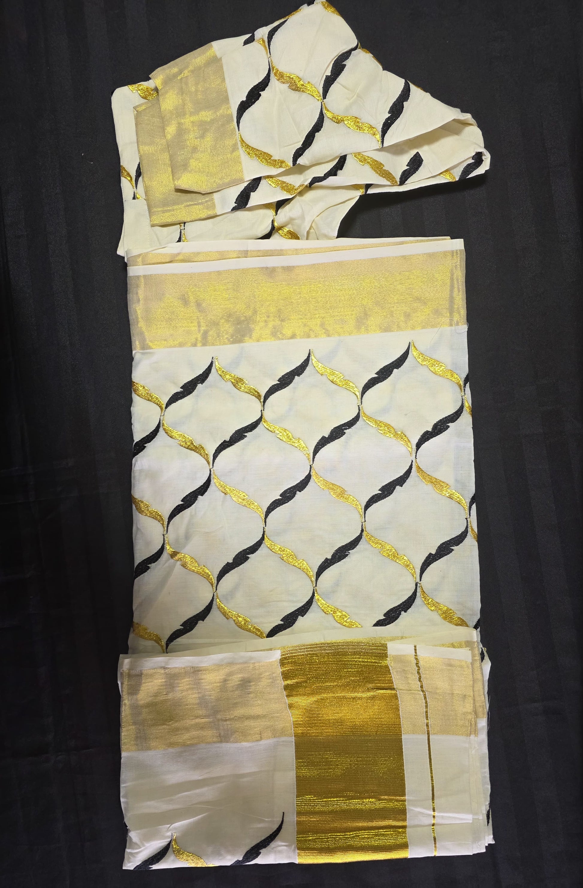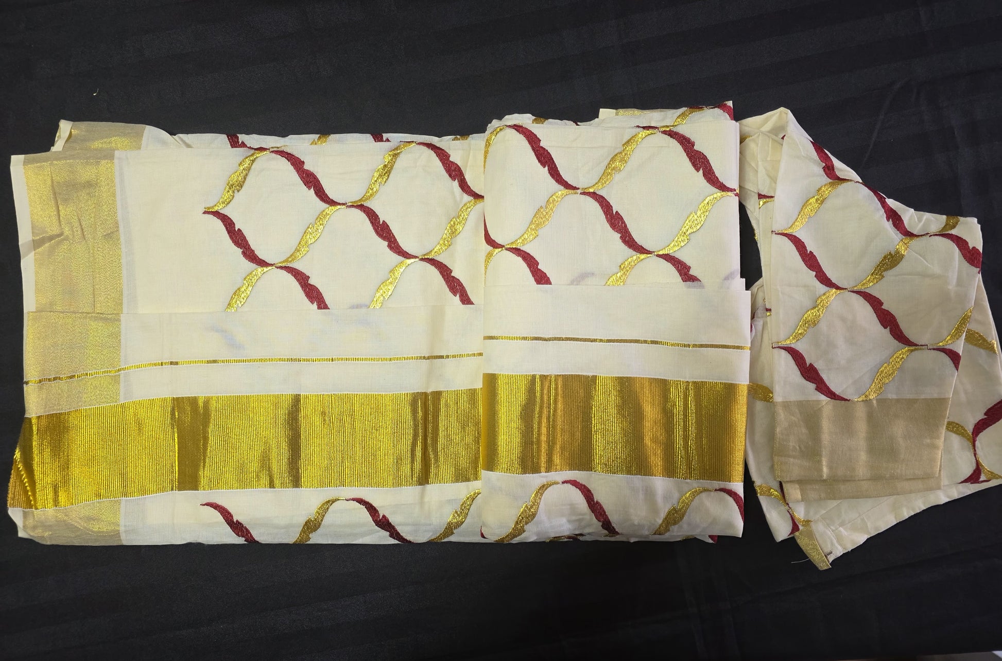 Kerala saree with chain design which comes in 3 shades and stitched blouse.