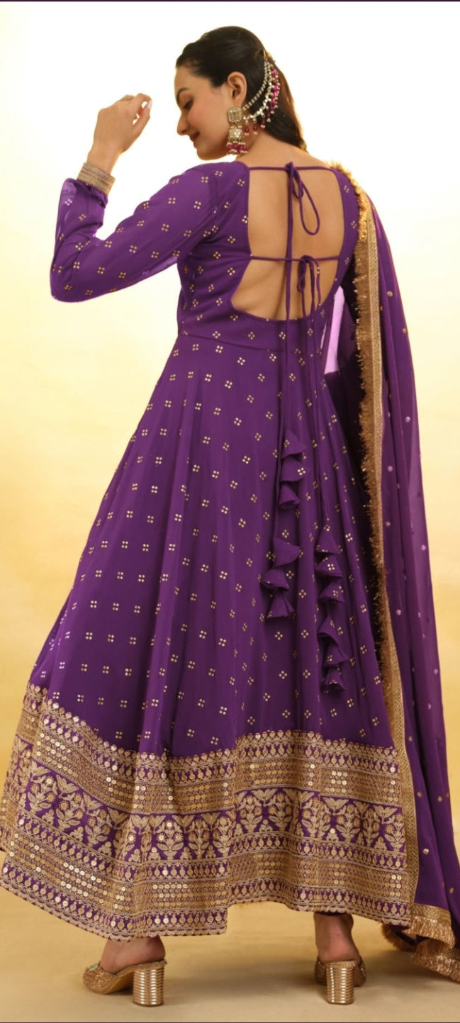 This elegant purple georgette Anarkali suit features intricate embroidery, perfect for festive and party occasions. Designed in a comfortable medium size, it includes matching tone leggings and a beautifully embroidered dupatta, creating a coordinated and sophisticated ensemble. The lightweight fabric ensures ease of movement while maintaining a graceful silhouette. Ideal for those seeking a blend of traditional charm and contemporary style.