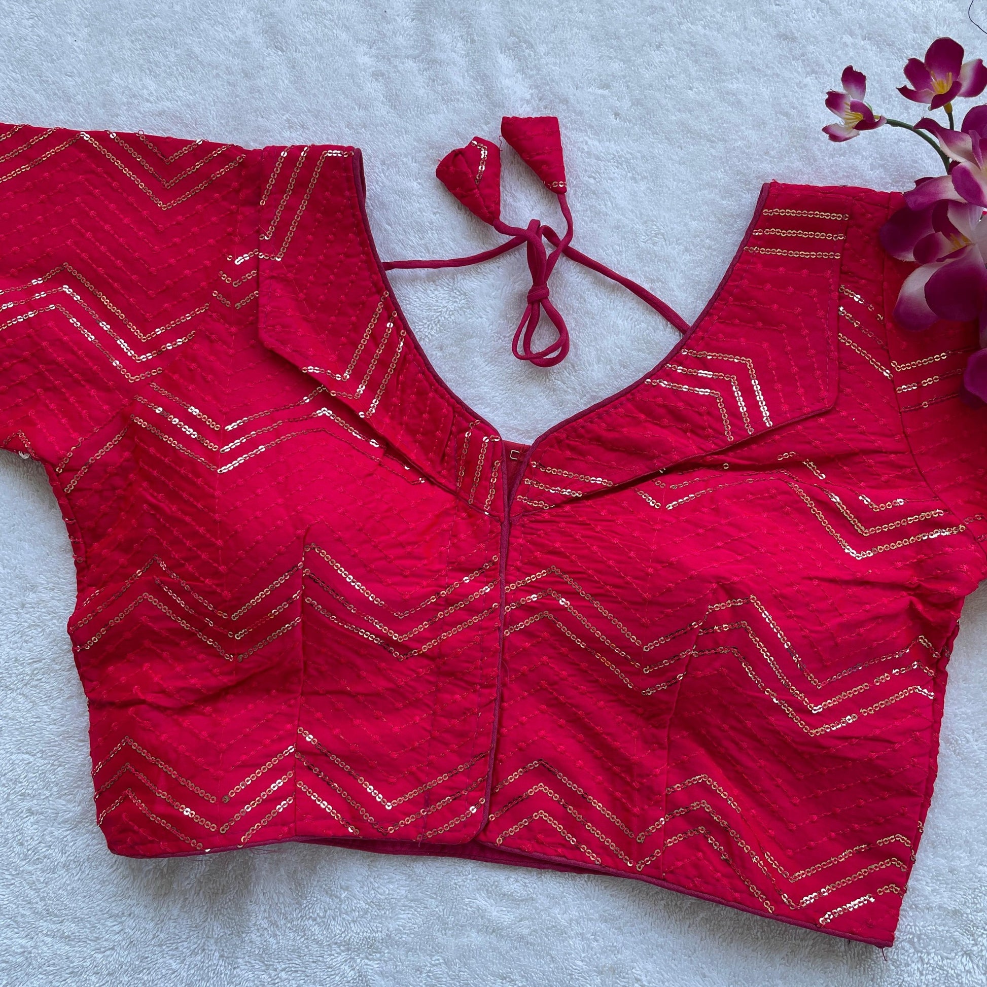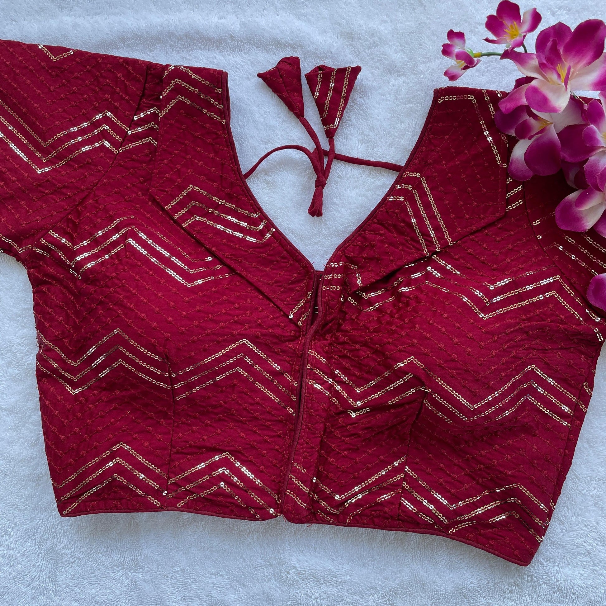 This designer blouses are crafted from soft silk, offering a luxurious feel and elegant drape. Designed in size 38 with a margin to alter up to size 40, it ensures a tailored fit. The blouse features intricate heavy sequence, thread zari, and delicate handwork, combining traditional craftsmanship with contemporary style for a standout look. Ideal for special occasions, it adds a refined touch to your ensemble.
