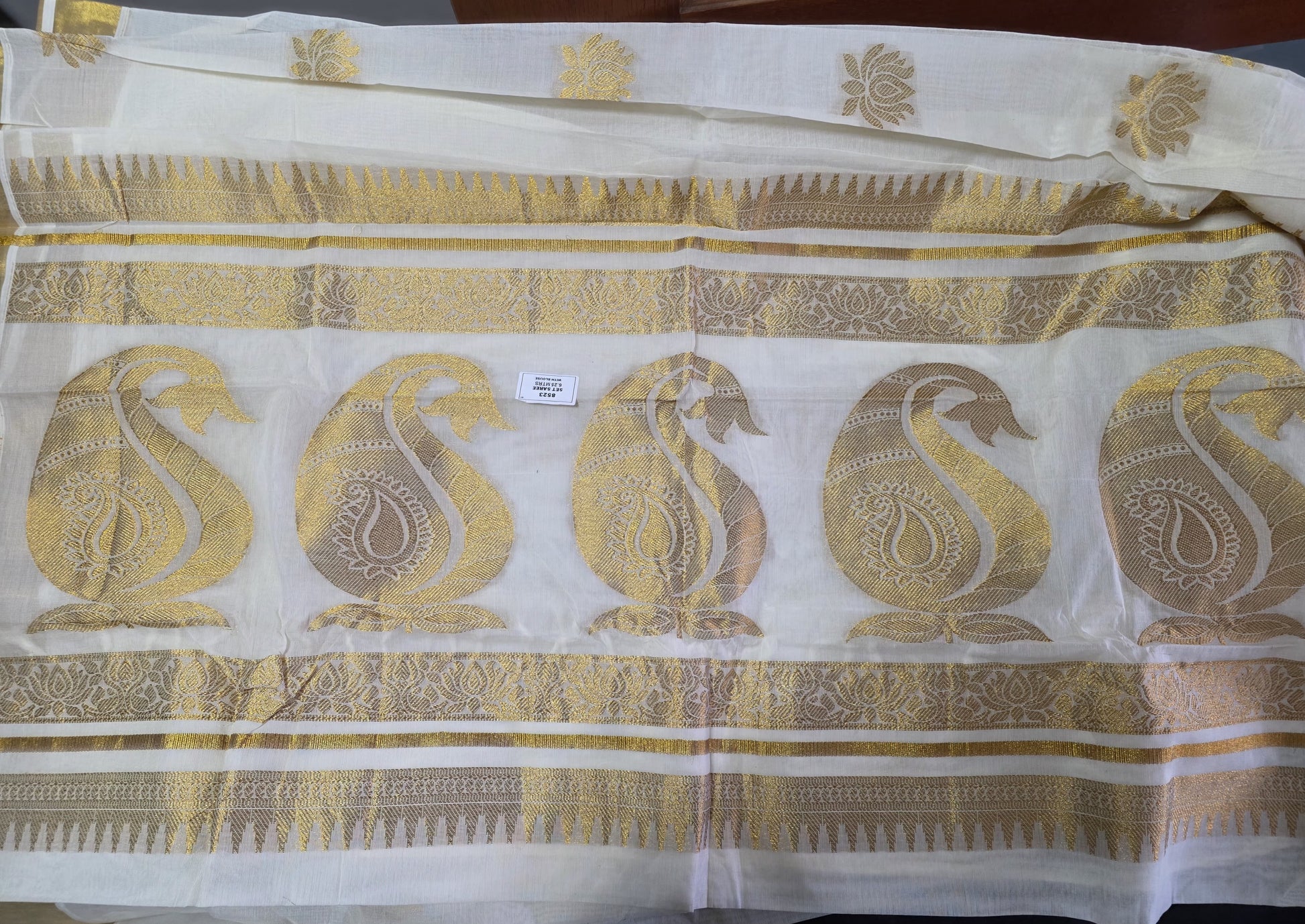 Ready to wear Kerala Cotton saree with lotus motifs and big mango motifs on pallu. Comes with plain off white saree blouse.