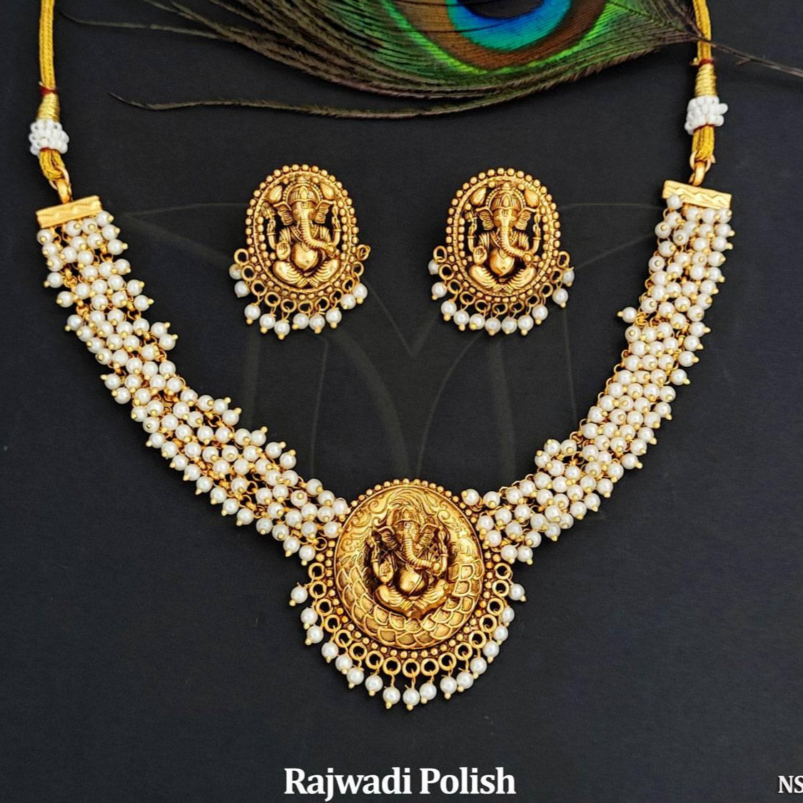 Pearl beaded necklace with Ganesha pendant and ear studs.